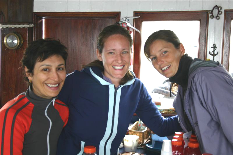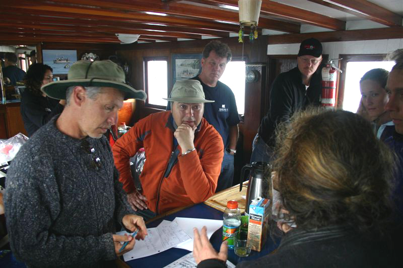 Director Steven Schachter and producer Mike Frislev discuss shots with underwater film crew aboard dive boat. |